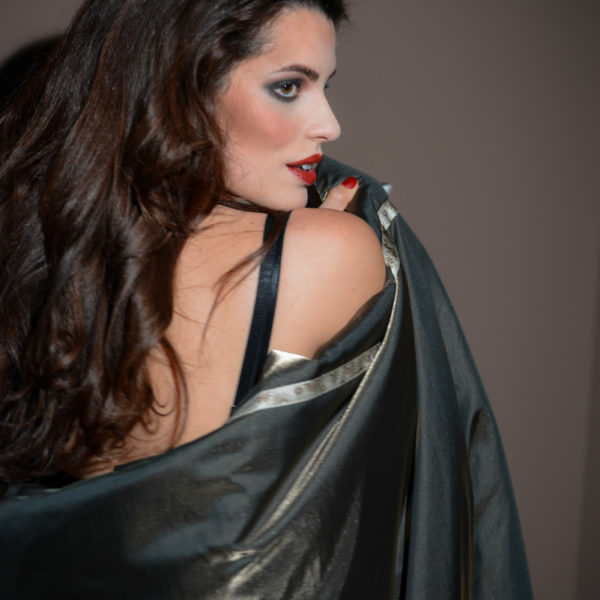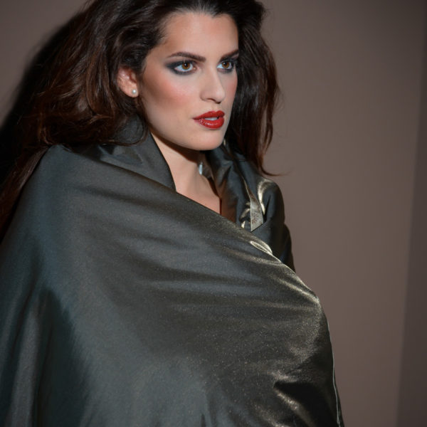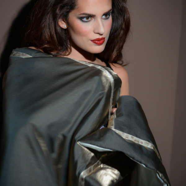 Plaid ``COFFEE & CLOUDS`` Changierender Seidentaft in cappuccino braun mit einer zarten Blumenborte abgesteppt, erinnert mit dem abgefütterten Rücken aus cremefarbender Maulbeerseide an die verschiedenen Facetten, wenn die Milch den Kaffee erobert.