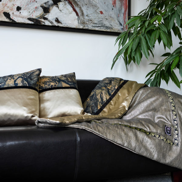 Edles goldbedampftes Leinen ,Seidentaft und der ausdrucksstarke Fantasydruck auf Baumwolle machen das Plaid und die dazu passenden Kissen nicht nur für Gothic Fans zu Lieblingsstücken.