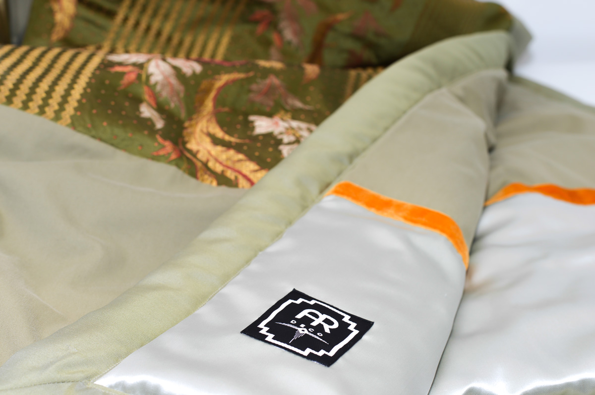 Plaid ``Lieblingsstück`` Bestickte Jacquard Seide von Rubelli in warmen Grüntönen kombiniert mit einer hochwertig Ägyptischen Baumwolle abgesetzt mit orang-farbener Samtborte passt wunderbar in modernes Ambiente, wie auch zu antiken Möbeln.